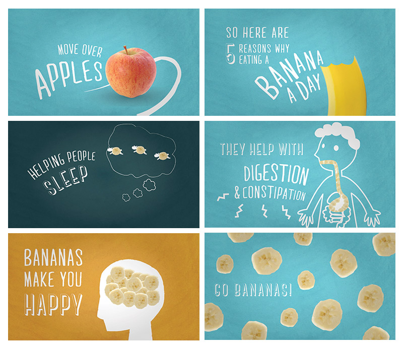 An informational video using type, motion, and images to portray the health benefits of eating bananas. This was created with Adobe After Effects.
